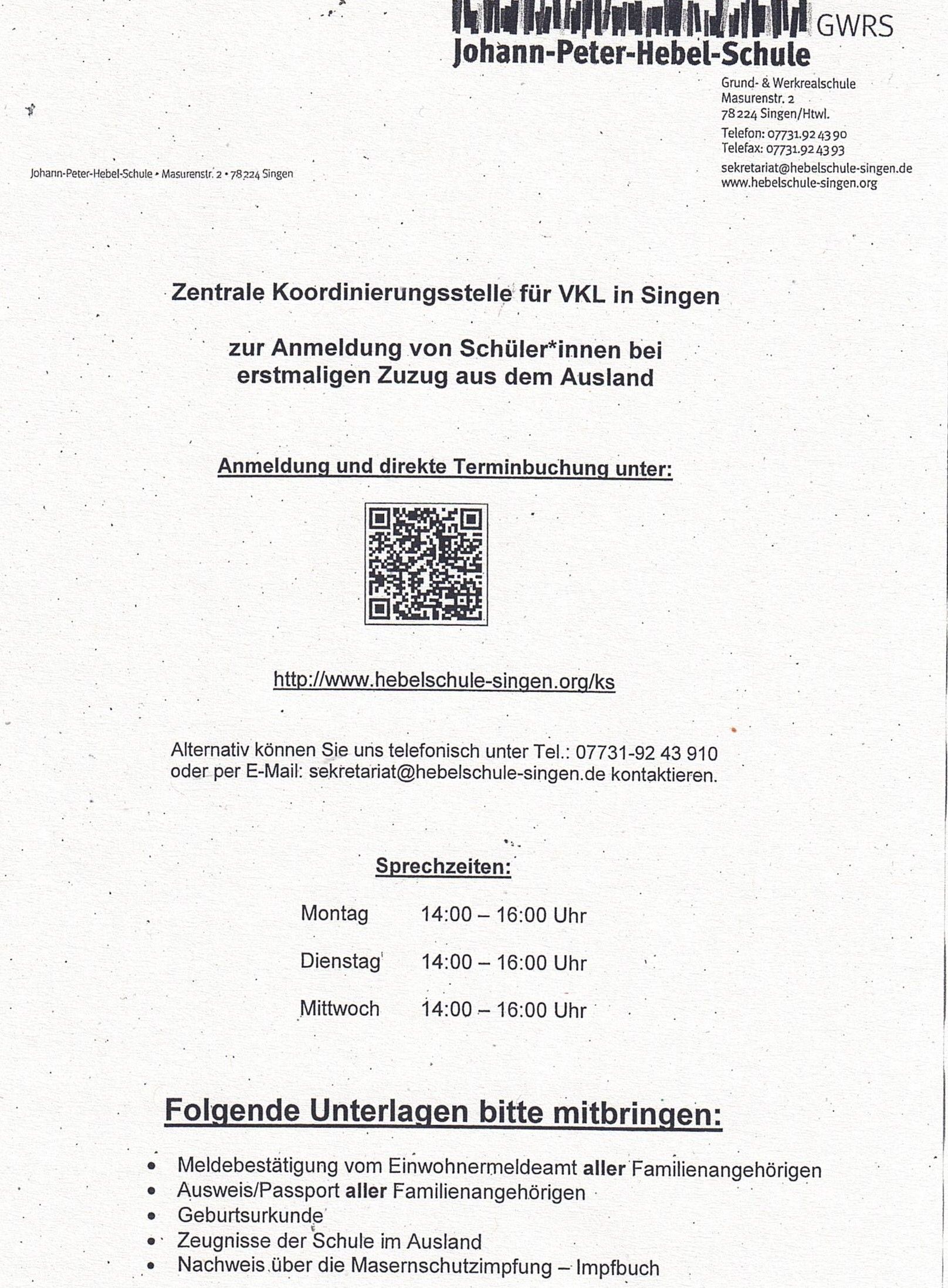 Die Koordinierungsstelle zur Anmeldung nicht deutsch sprechender Schüler in der Vorbereitungsklasse befindet sich an der Hebelschule (Adresse: Masurenstr. 2, 78224 Singen Telefon: 0773192-4390)