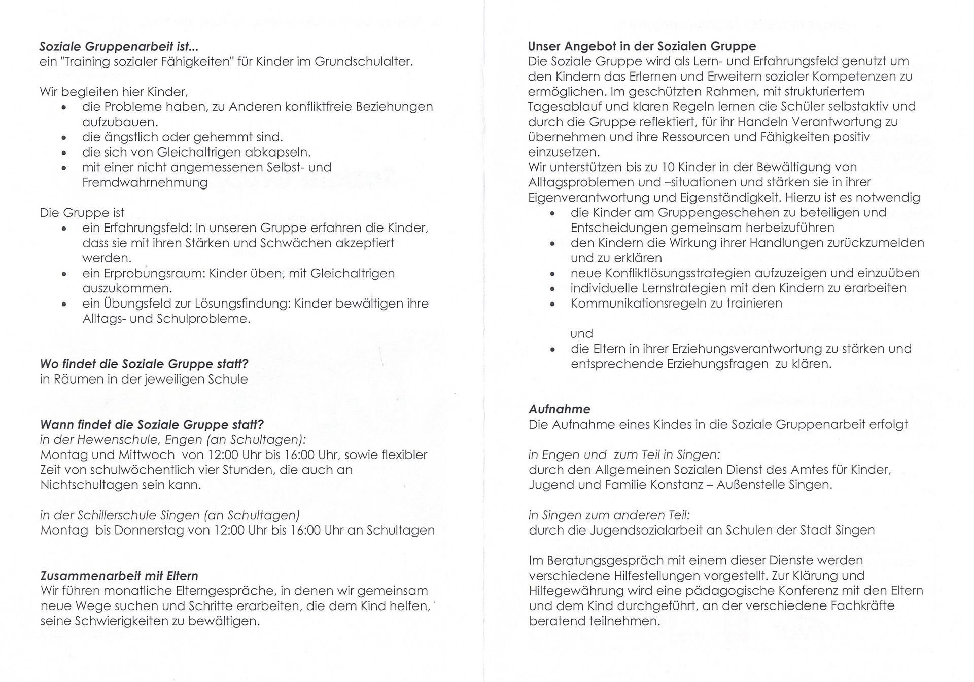 Die Soziale Gruppe wird als Lern- und Erfahrungsfeld genutzt, um den Kindern das Erlernen und Erweitern sozialer Kompetenzen zu ermöglichen. Im geschützten Rahmen, mit strukturiertem Tagesablauf und klaren Regeln lernen Schüler selbstaktiv und durch die Gruppe reflektiert, für ihr Handeln Verantwortung zu übernehmen und ihre Ressourcen und Fähigkeiten positiv einzusetzen.
