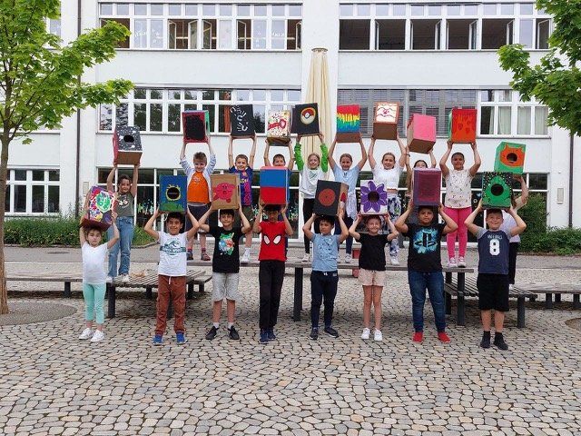 2023: "Der Förderverein der Schillerschule spendierte allen 14 Schulklassen eine randvoll gefüllte Spielkiste für den Pausenhof. Schulleiter Gregor Fischer dankte Sonja Moré, Vorsitzende des Fördervereins, im Namen aller Kinder herzlich für die großzügige Spende im Wert von 1.500€." (Mit auf dem Bild die Klasse 1a mit Lehrerin Tina Grizzanti)
