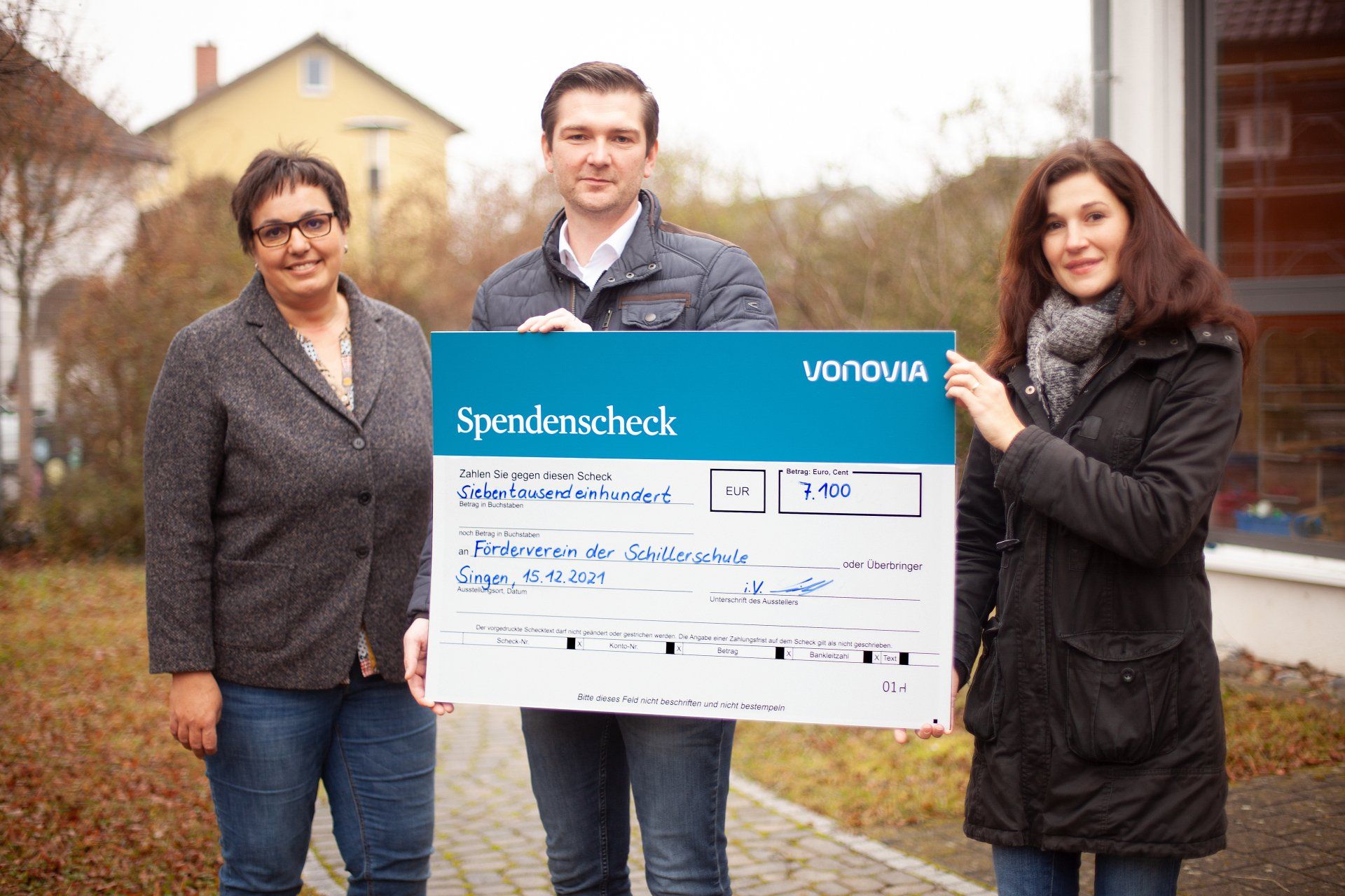 Frau Sonja Moré zusammen mit der Konrektorin Frau Schaub-Rüegg bei der Spendenübergabe des Bodentrampolins der Baugesellschaft Vonovia mit dem Regionalleiter Herrn Löhle.