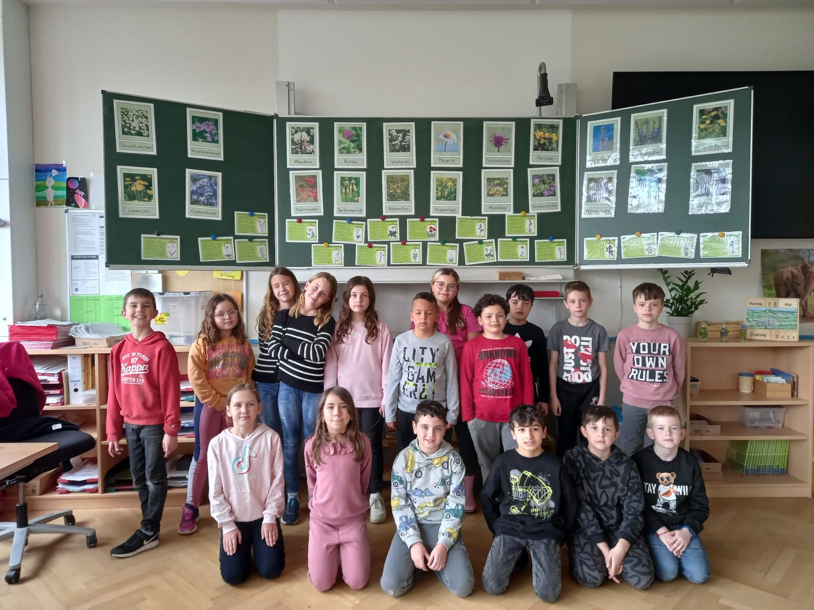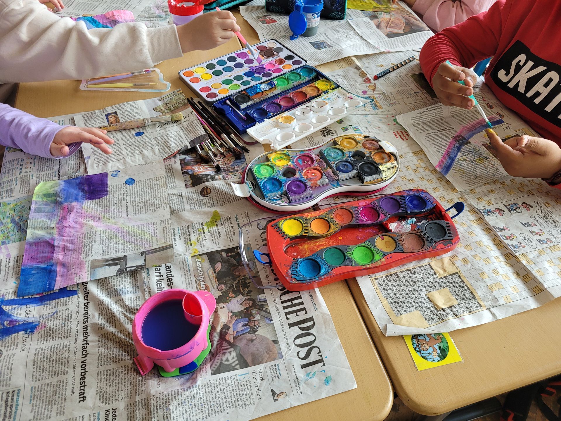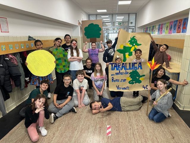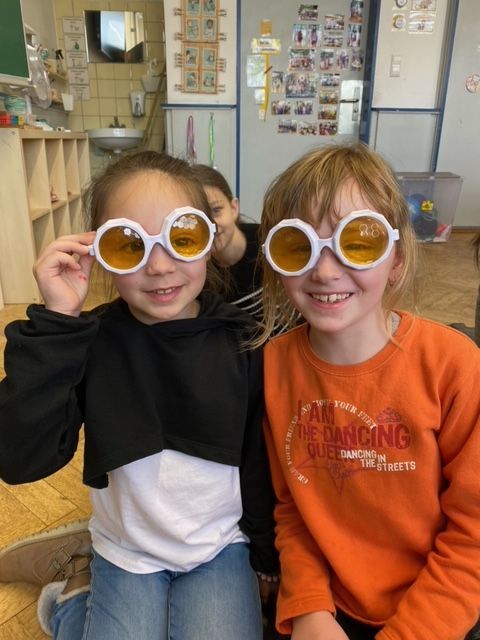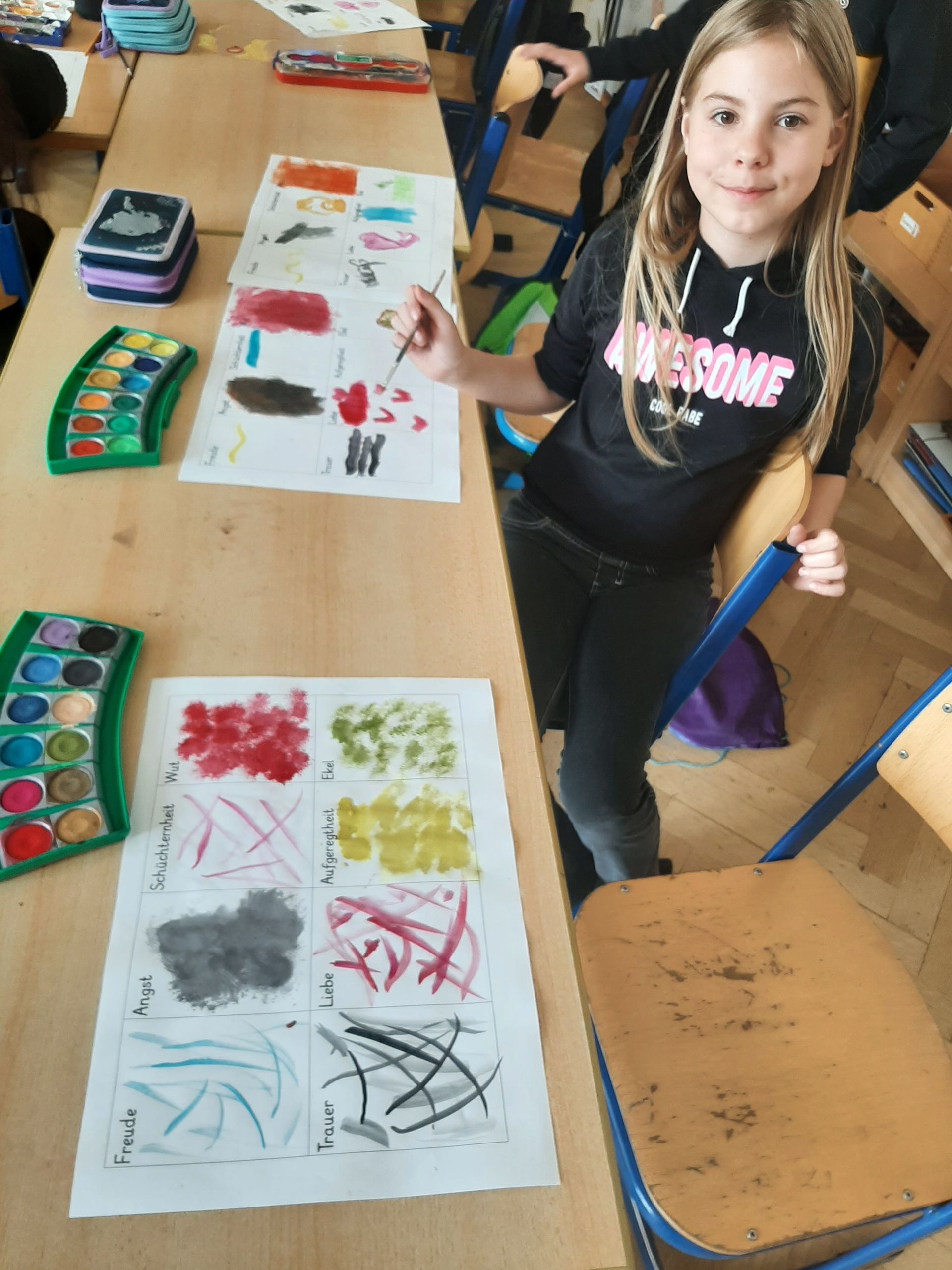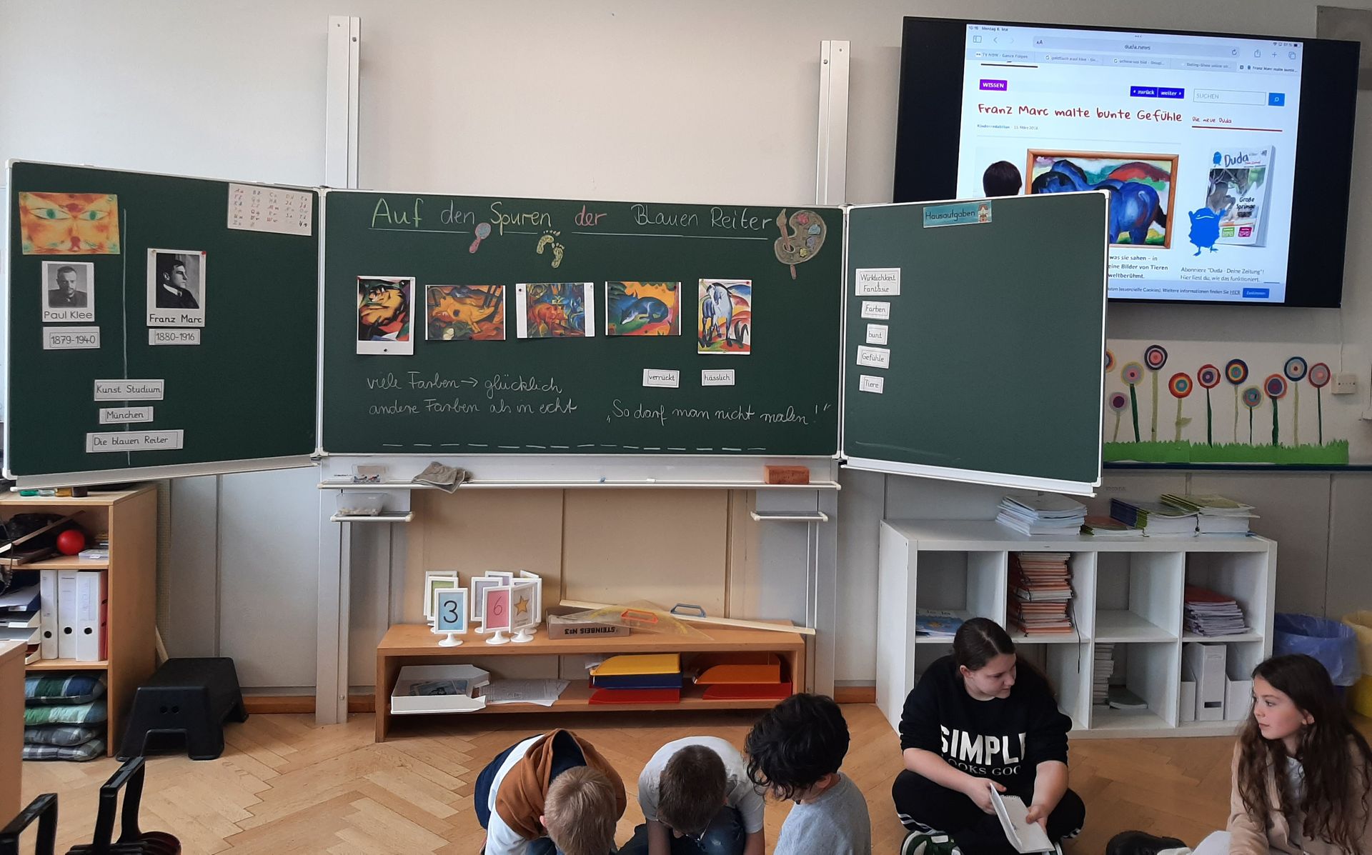 3a - Die Klasse 3a widmete ihre Projekttage der Kunst und begab sich drei Tage lang "Auf die Spuren der Blauen Reiter". Die Schüler/innen lernten zwei Mitglieder der Künstlergruppe "Blaue Reiter" kennen: Franz Marc und Paul Klee. In Gruppen erarbeiten sie Merkmale des Expressionismus und Infos zu den beiden Künstlern. Die Kinder fanden schnell heraus, dass sie durch verschiedene Farben Gefühle in Bildern ausdrücken können. Das versuchten wir natürlich direkt selbst! So entstand unser Gefühle-Bild.